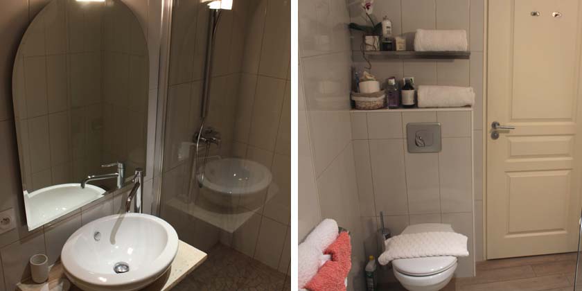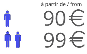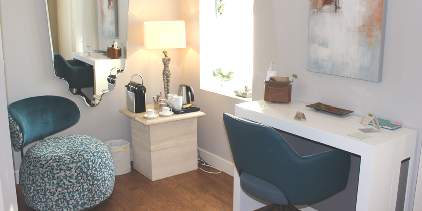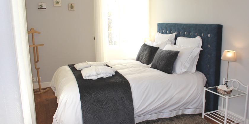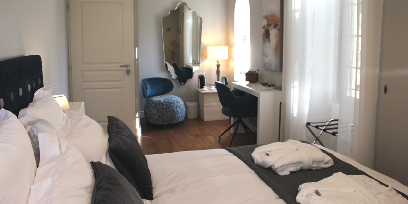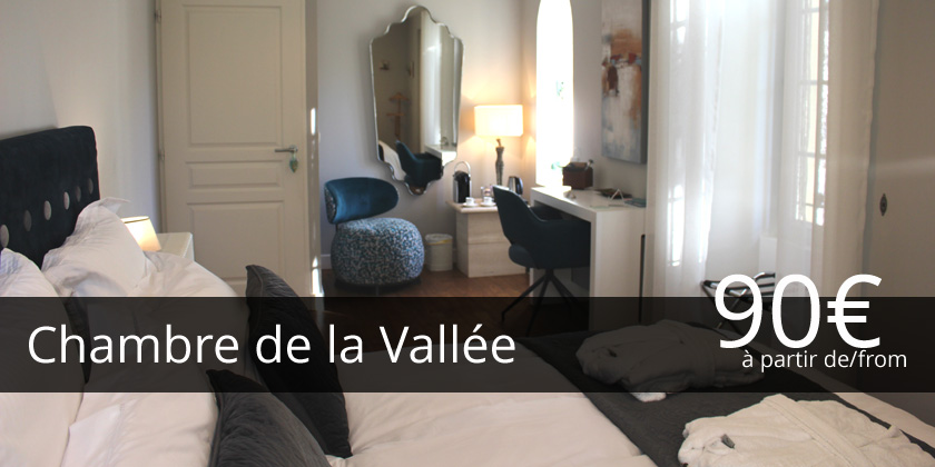 Les tons calmes et plafond haut contribuent à un sentiment de bien-être. La vue dominante offre au regards le pâturage des chevaux dans la vallée bordée par un flux abondant. Cette chambre était le confessionnal de la ferme fortifiée, mis en valeur par l'architecture particulière de l'un de ses fenêtres. Les deux lits simples sont jumelables pour faire un grand lit double à la demande. Sa salle d'eau privative est entièrement carrelée avec WC suspendu, douche à l'italienne et vasque sur un support en granit. Un ensemble de grande et petite serviettes et gant de toilette par personne est fourni, ainsi qu'un sèche-cheveux et des articles de toilette.