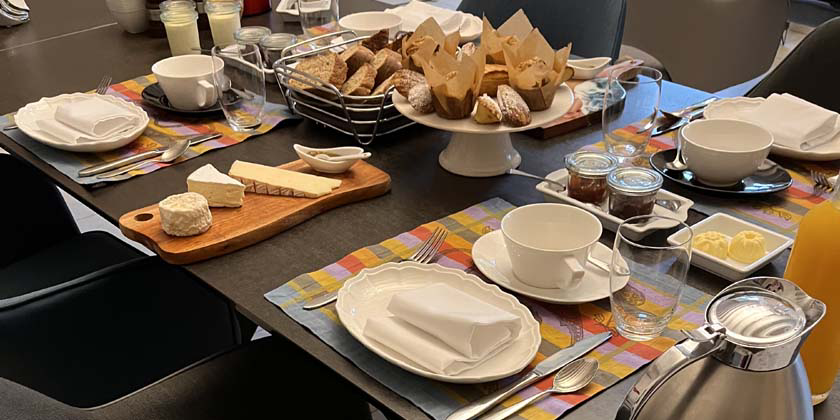 Viennoiserie, boissons chauds, sélection de pain frais, beurre et confitures artisanales, jus de fruits, céréales, yaourt, fruits...